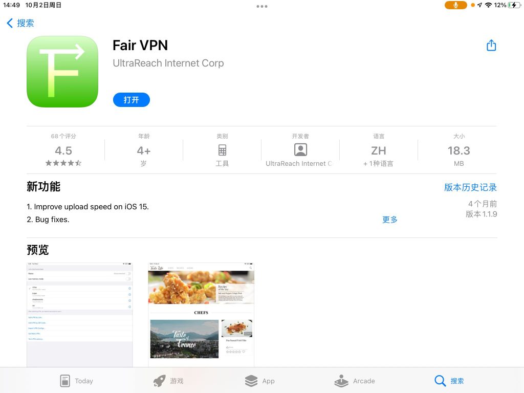 然后到美区的Appstore寻找一键vpn或shadowsocks/V2Ray的客户端例如fair(免费)、shadowsocket(付费)