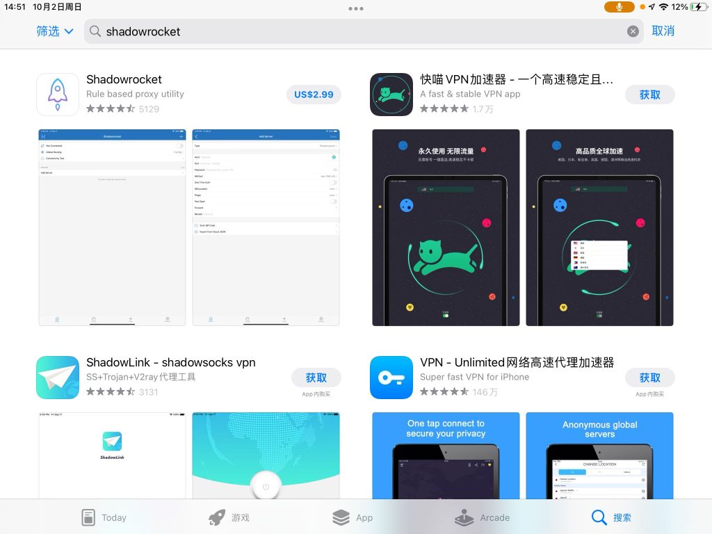 用搞好的美区ID登录App Store,搜索VPN(不推荐)或下载shadowrocket(付费)